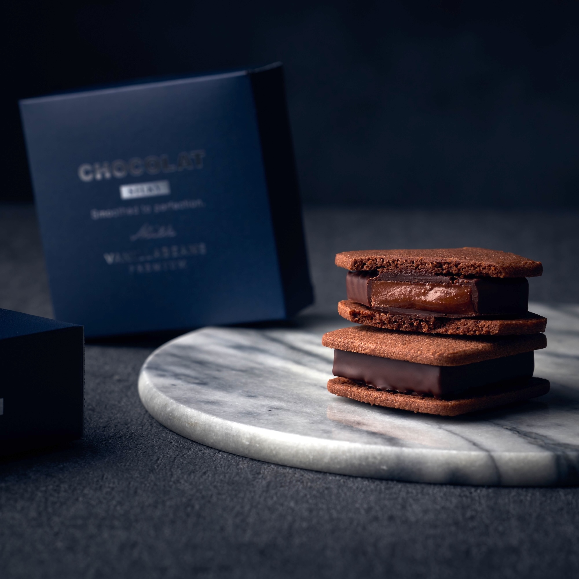 長年愛される生チョコクッキーサンド「ショーコラ」から、さらなる幸福感をお届けする最高峰ラインナップが登場。シルクのような上質なくちどけに注力した一品です。コンセプトは「じゅわり、とろける贅沢体験。」一口目は、常温でそのまま。二口目は、電子レンジで600W5秒を目安に温めてお楽しみください。パッケージも通常のショーコラと異なり、シアンベースの色合いに銀の箔押しが施され、プレミアムライン限定のオリジナル巾着付きタイプもご用意いたしました。